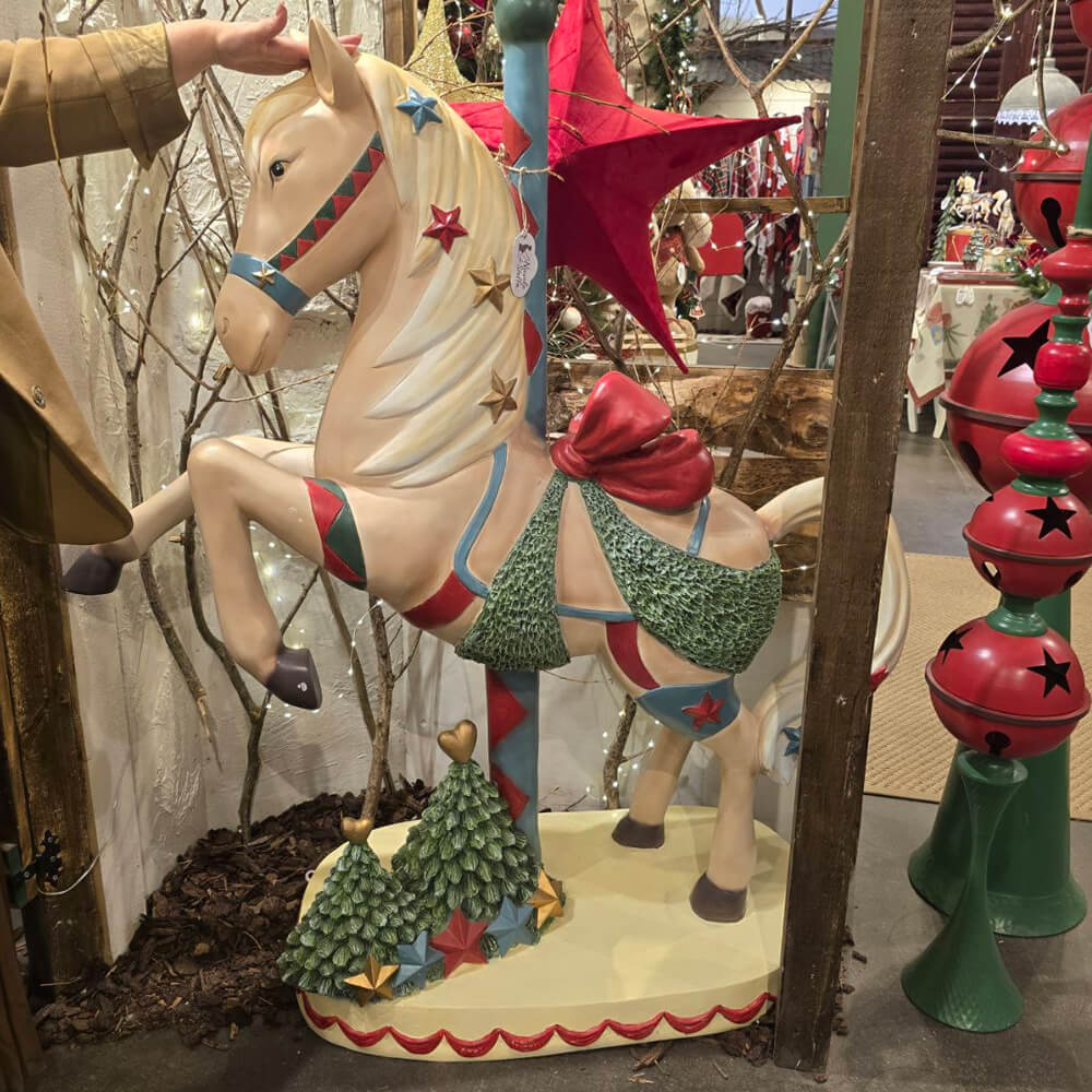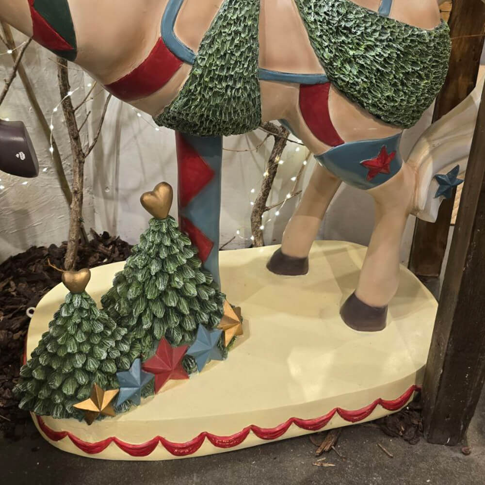 Il corpo del cavallo è arricchito da una sella e una gualdrappa in rilievo con effetto pino, un grande fiocco rosso e stelline applicate lungo la criniera e la coda. Grazie alle sue dimensioni generose (alto 150 cm), questo pezzo è ideale per hall, vetrine, ingressi o angoli scenografici della casa durante il periodo natalizio.