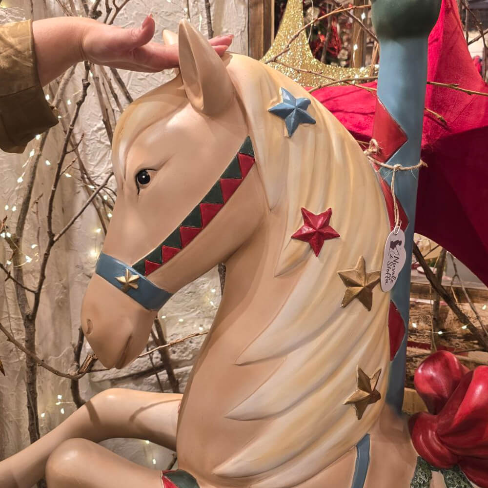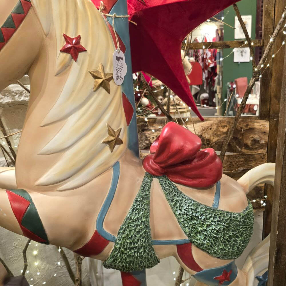 Il Cavallo Decorativo La Giostra di Amelie firmato Nuvole di Stoffa è un complemento d’arredo scenografico e ricercato, pensato per chi desidera un’atmosfera natalizia sorprendente e raffinata. Realizzato in resina con una finitura opaca, presenta una palette colori armoniosa tra crema, rosso, verde e accenti dorati. Il cavallo, in posizione rampante, è montato su un palo a strisce colorate con stella dorata in cima, mentre la base ospita due alberelli decorativi con cuori oro e stelle rosse e blu.