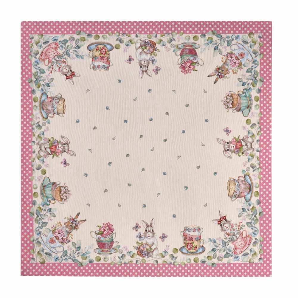 Centro tavola pasquale in tessuto jacquard dall’aspetto ricco e materico, con fondo chiaro e cornice rosa a pois. Il bordo è illustrato con coniglietti, tazze, teiere e cestini fioriti, foglioline e farfalle in stile acquerello: un colpo d’occhio romantico che veste subito la tavola. Fa parte della collezione Tè nel Bosco di Nuvole di Stoffa.
