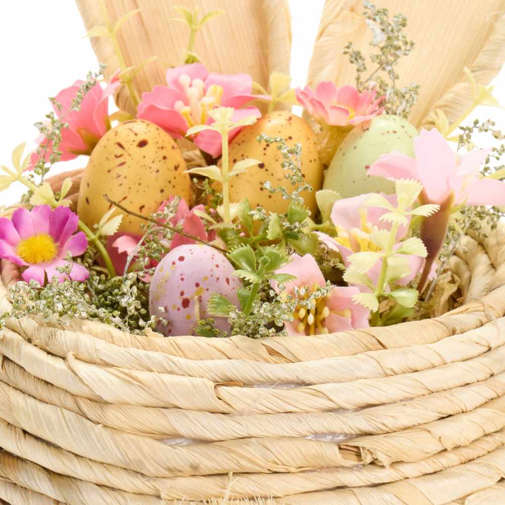 Un piccolo capolavoro di Pasqua: cestino in vimini intrecciato a forma di coniglio, con orecchie alte naturali e codina soffice. La composizione con ovetti maculati e fiori pastello è già pronta, quindi basta appoggiarlo su tavolo, credenza o camino per creare subito atmosfera. Ideale anche come idea regalo “pronta scena”.