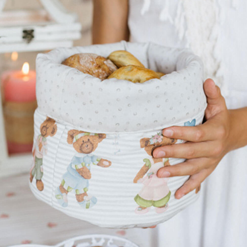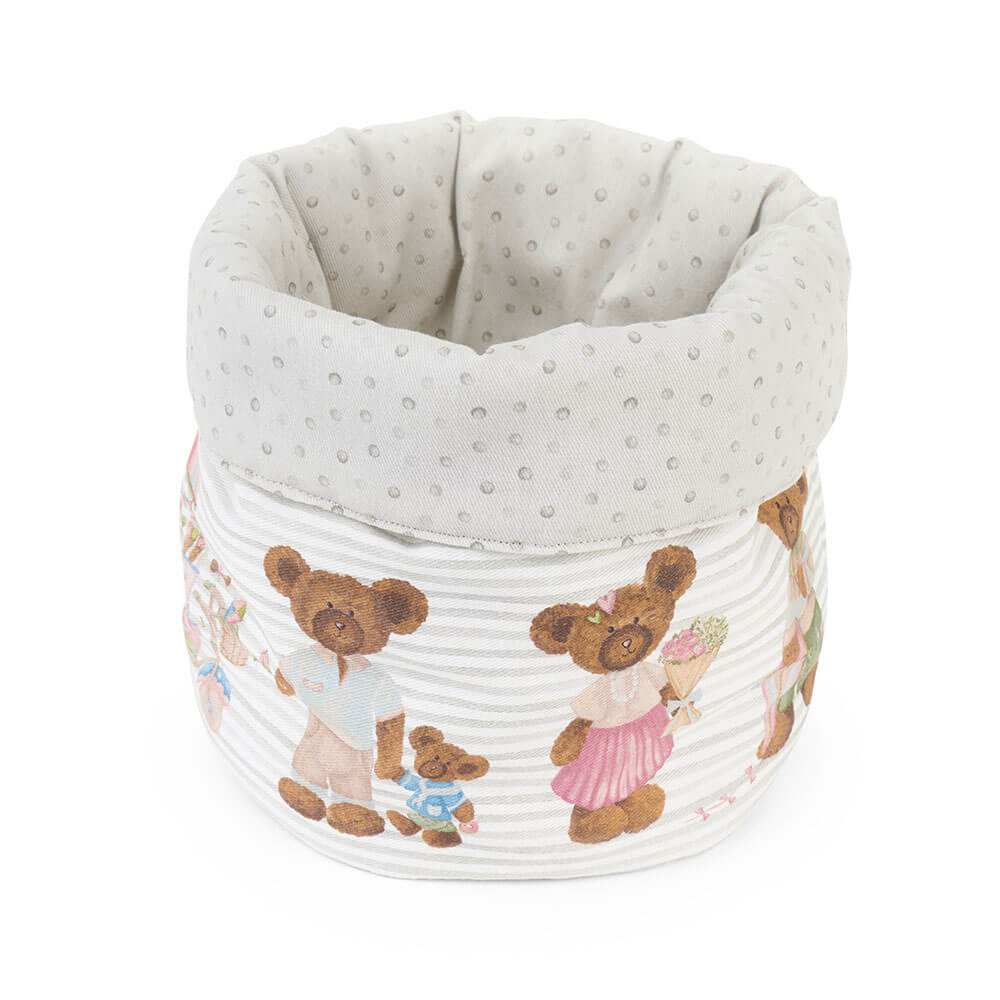 Il Cestino portatutto Sweet Bear di Nuvole di Stoffa è il classico “mai più senza” che rende la casa più ordinata e più bella. In cotone imbottito, mantiene la forma ma resta soffice al tatto; il bordo risvoltato mostra l’interno avorio a micro pois, elegante e luminoso. All’esterno, le righe delicate fanno da sfondo alla scena Sweet Bear con la famiglia di orsetti e dettagli pastello, perfetti per uno stile romantico e raffinato. Ideale in cucina per pane e tovaglioli, in bagno per cosmetici o in cameretta per piccoli oggetti: un solo pezzo, mille usi.