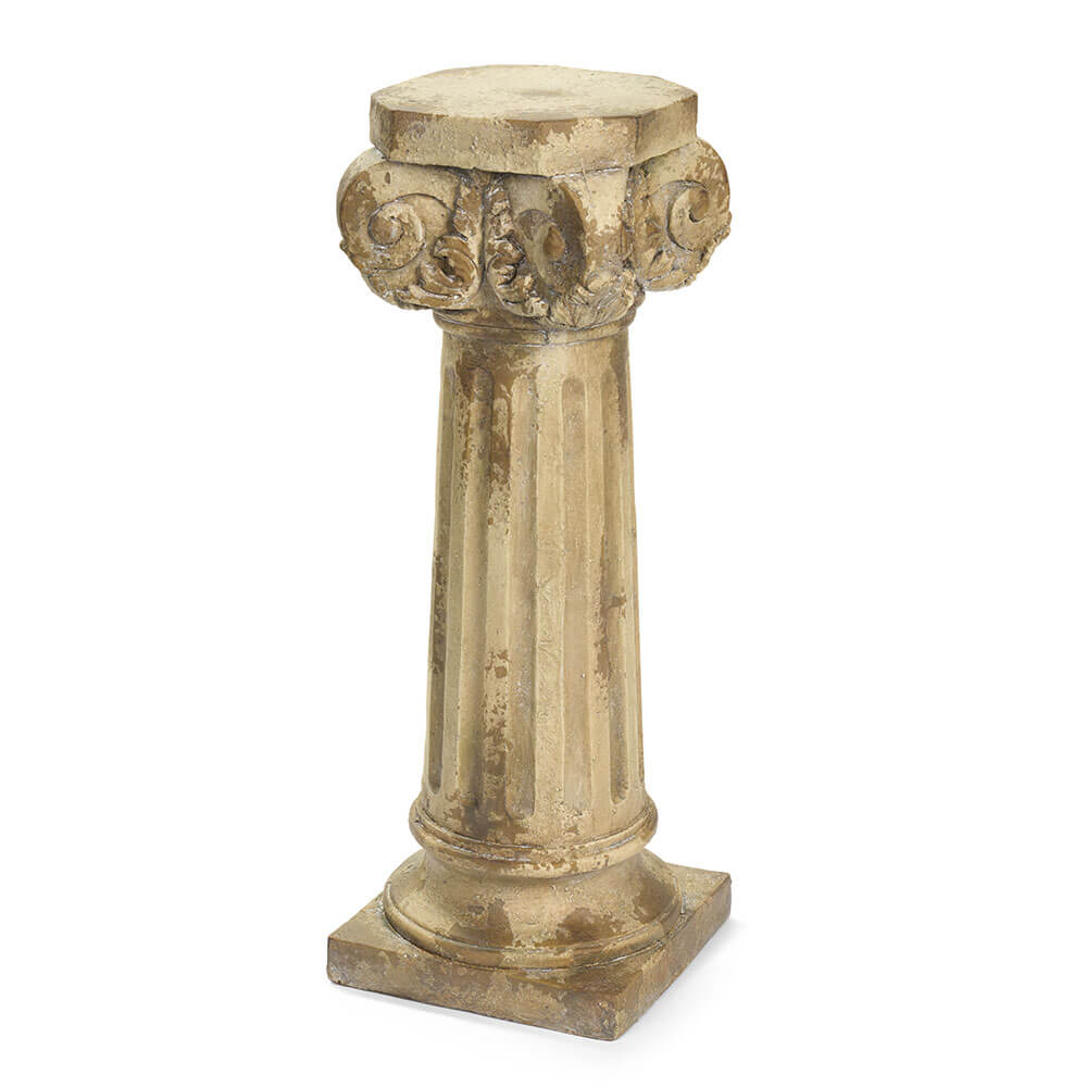 Colonna decorativa in stile classico con fusto scanalato e capitello a volute tipo ionico. La finitura è opaca effetto pietra antichizzata, nei toni beige/tortora con leggere “consumature” più scure che la rendono subito autentica. Base e piano superiori quadrati: perfetta per valorizzare busti, vasi e lanterne.