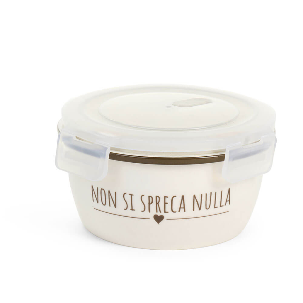 Contenitore Nuvole di Stoffa in fine stoneware (ceramica) con tappo in plastica trasparente a chiusura pratica. La forma compatta e la superficie liscia color crema sono valorizzate dalla scritta “Non si spreca nulla” in tonalità calda, accompagnata da un piccolo cuore decorativo. Ideale per conservare con cura e consapevolezza.