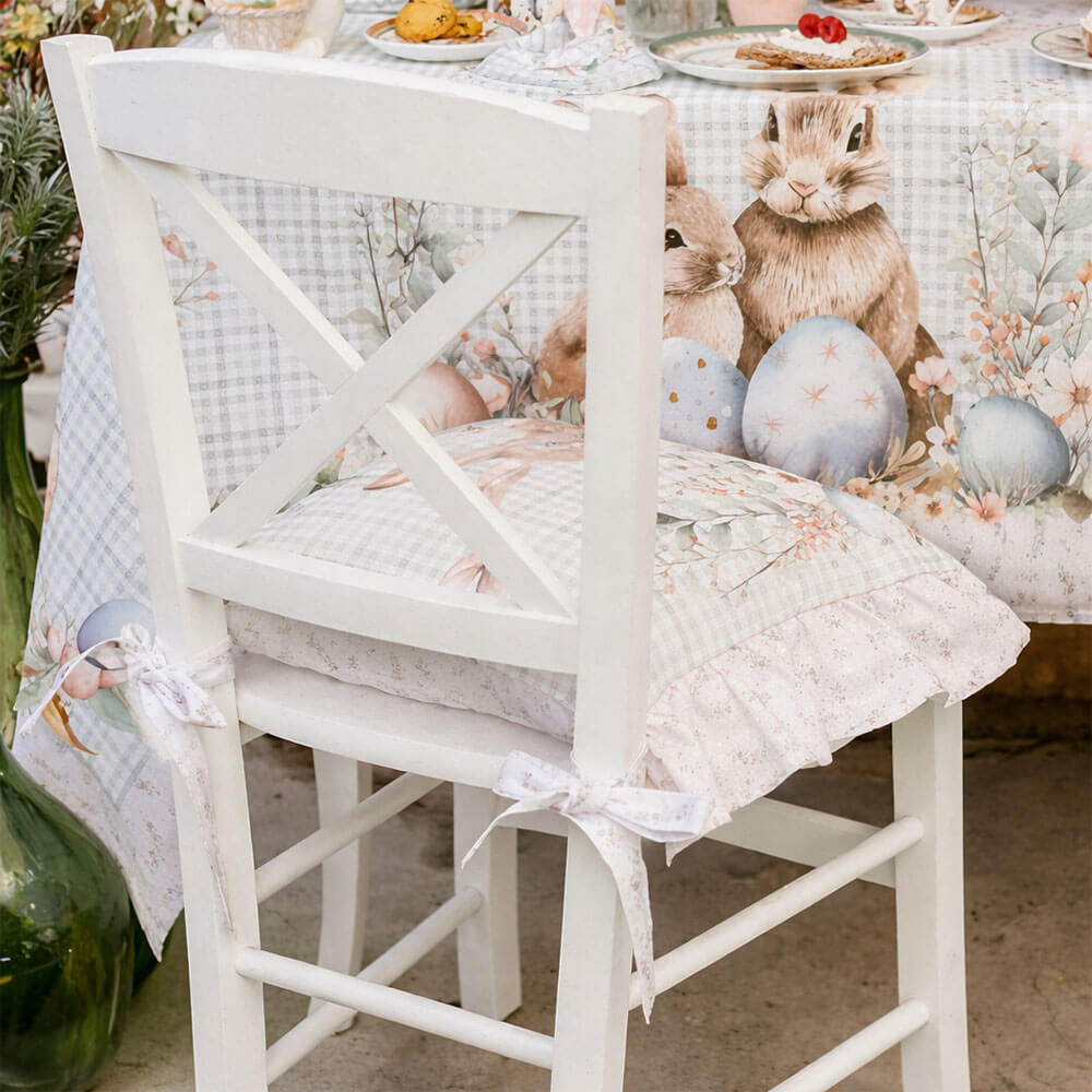 La balza arricciata in tessuto coordinato dona movimento e un irresistibile stile shabby chic, mentre i laccetti laterali permettono un fissaggio stabile alla sedia. Ideale per impreziosire la tavola di Pasqua o per aggiungere un tocco primaverile alla cucina e alla sala da pranzo.