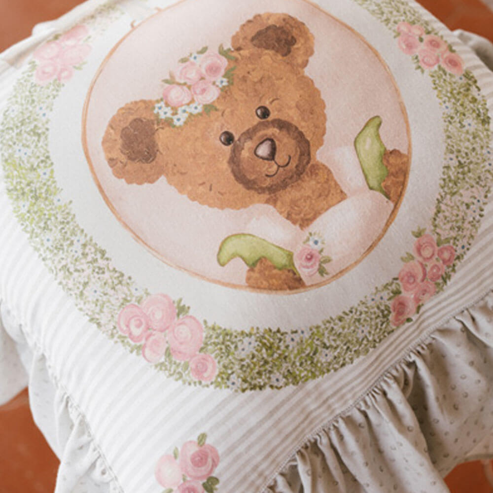 Il Cuscino Sedia Sweet Bear Lei di Nuvole di Stoffa dona comfort e un tocco shabby chic alla tua tavola. È imbottito e rifinito con una balza ampia in tessuto chiaro a micro pois, morbida e scenografica. La seduta presenta un fondo a righe sottili con medaglione centrale: l’orsetta “Lei” con coroncina di fiori, ghirlanda verde e roselline rosa, completata da un fiocco delicato. I laccetti grigio perla lo tengono ben fermo e ordinato. Perfetto per rinnovare le sedie in un attimo e coordinabile con runner, tovaglie e tessili Sweet Bear.