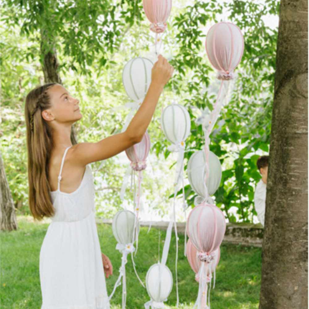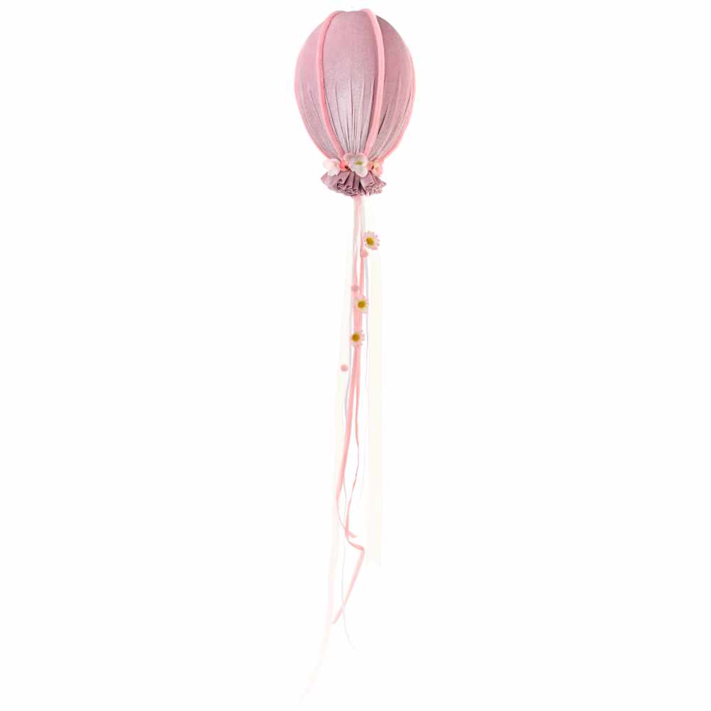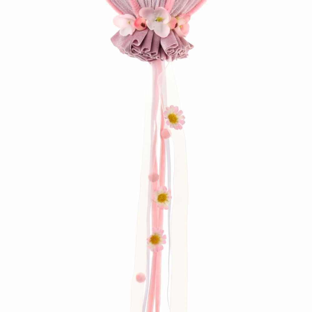La mongolfiera viola Fiorirà in formato H 24 cm è un dettaglio “wow” ma delicato: tessuto a spicchi con effetto plissé, base arricciata e coroncina di fiorellini. I nastri lunghi, con margheritine applicate e mini perle, donano movimento e verticalità. Perfetta appesa a un ramo, vicino a una finestra o in un angolo relax.