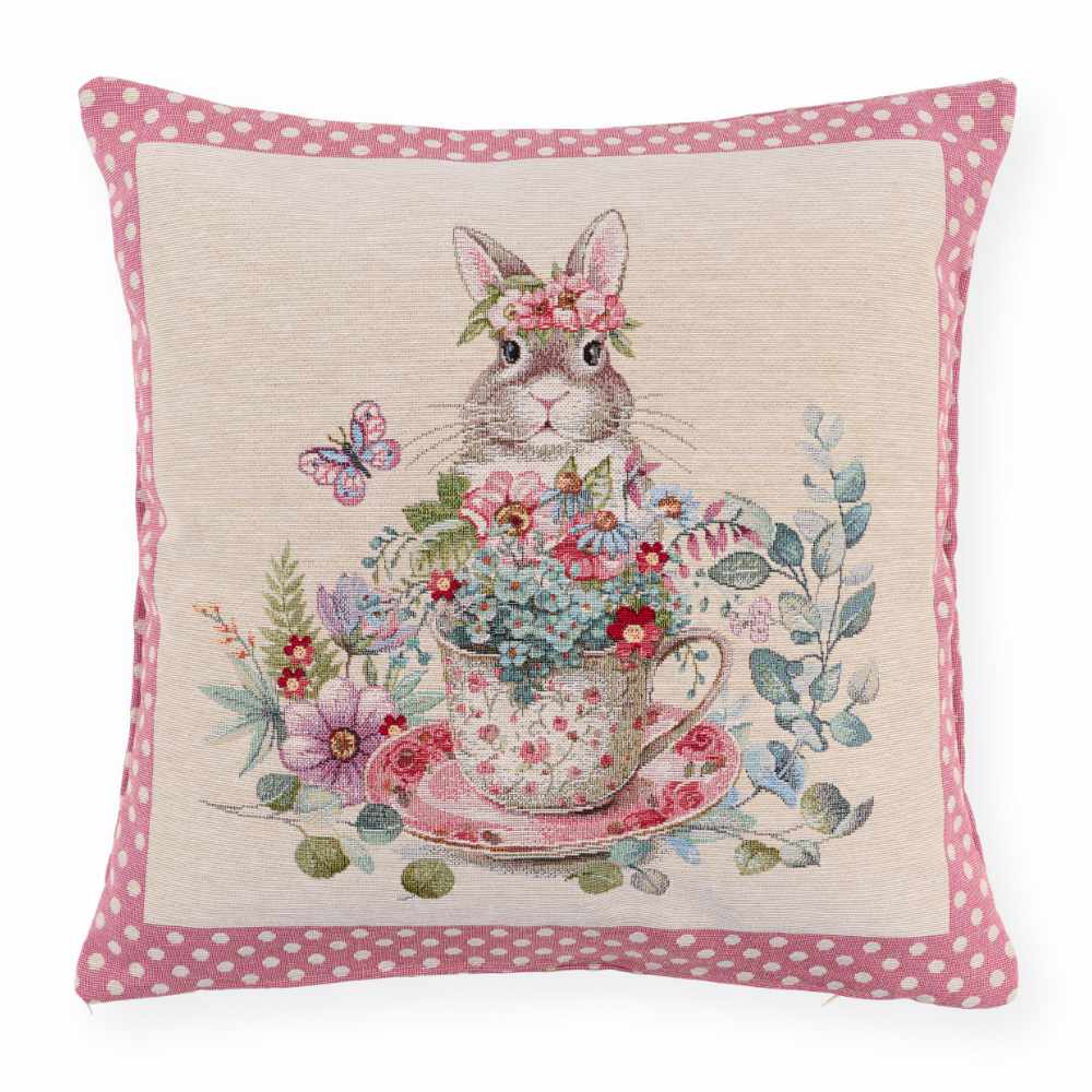 Federa arredo in tessuto jacquard dal look materico, con cornice rosa a pois bianchi. Al centro un coniglietto con coroncina di fiori che spunta da una tazza floreale su piattino rosa, circondato da foglie verde salvia, fiori pastello e una farfallina. Perfetta per dare un tocco pasquale chic a divano e letto.