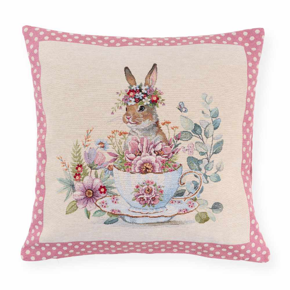 Federa arredo in tessuto jacquard collezione Tè nel Bosco, dal look ricco e materico. Fondo neutro con illustrazione stile acquerello: coniglietto con coroncina floreale che sbuca da una tazza azzurra decorata, circondato da fiori e foglie. Bordo rosa a pois bianchi che incornicia e illumina il divano.