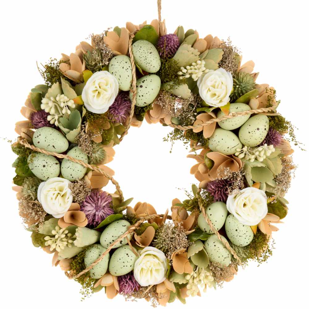 Porta la Pasqua alla porta di casa con una ghirlanda elegante e piena di dettagli: ovetti maculati color salvia, fiori bianchi e accenti lilla, foglie morbide tono su tono e intrecci naturali che danno un tocco country chic. Perfetta su ingresso, camino o parete: riempie lo spazio senza appesantire e crea subito atmosfera.