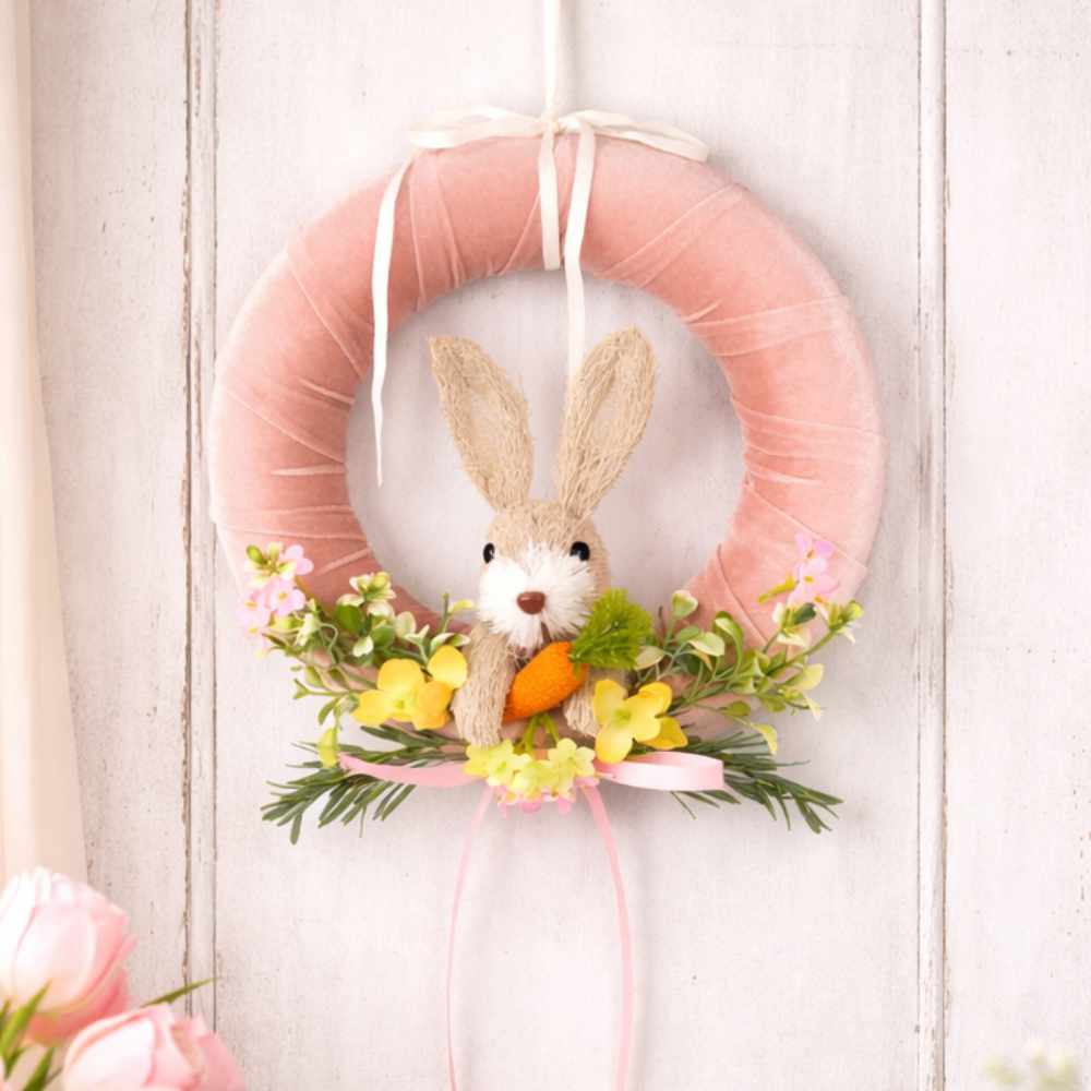 Della collezione Pepen, ghirlanda imbottita rivestita in tessuto rosa cipria effetto vellutato, con fiocco e nastro bianco per appenderla. Al centro un coniglietto in fibra naturale con musetto bianco, che stringe una carota arancione. Completano la scena foglie verdi, rametti tipo pino e fiorellini rosa e giallo tenue, più fiocco rosa con nastri pendenti.