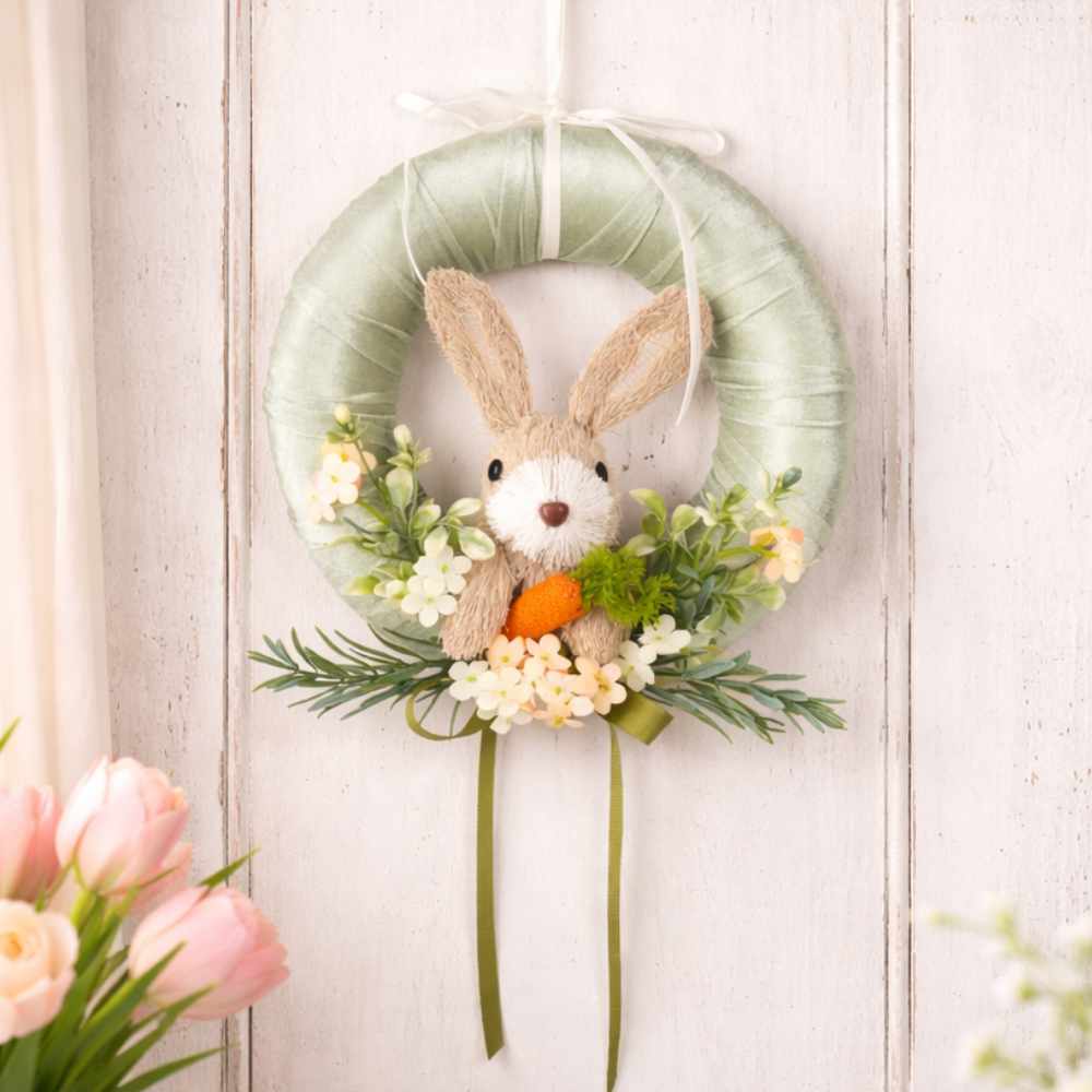 Della collezione Pepen, una ghirlanda rivestita in tessuto verde salvia dall’effetto satinato e morbido, con coniglietto centrale in fibra naturale, orecchie alte e musetto bianco. Tra foglioline e fiorellini panna spunta una carota arancione, per un tocco pasquale elegante. Nastro bianco per appenderla e nastri verdi pendenti.