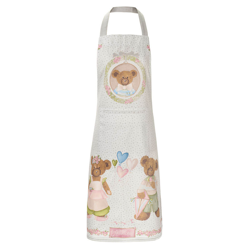 Il Grembiule Sweet Bear Lui di Nuvole di Stoffa è perfetto per chi ama una cucina curata, dolce e luminosa. Il fondo avorio a micro pois dona un’eleganza discreta, mentre il medaglione sul petto con l’orsetto “Lui” (tra ghirlanda verde, roselline rosa e fiocco) crea un punto focale raffinato. In basso, la scenetta con i due orsetti e i palloncini a cuore aggiunge quel tocco romantico che fa subito atmosfera. Il taschino frontale è comodissimo per canovacci e utensili: pratico da usare, bellissimo da lasciare a vista.