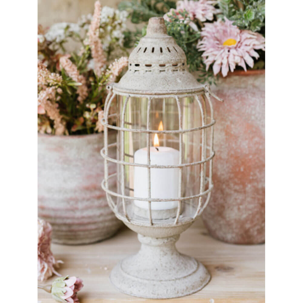Questa lanterna Nuvole di Stoffa unisce carattere e delicatezza: metallo con finitura anticata color avorio/grigio e vetro trasparente, protetto da una griglia che crea un effetto scenografico quando la fiamma è accesa. La cupola traforata alleggerisce il design e la base a piedistallo la rende stabile su consolle, tavolo o davanzale. Ideale per atmosfera soft in salotto, ingresso o veranda coperta: basta una candela e l’ambiente cambia subito.