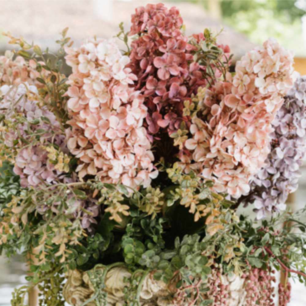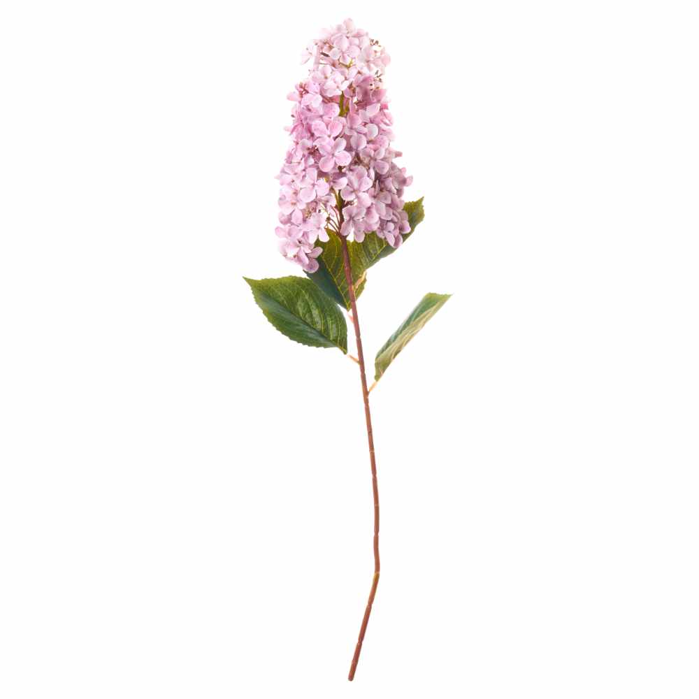 Ramo di ortensia a grappolo in lilla sfumato, con corolle compatte e petali piccoli dall’effetto morbido e naturale. Le foglie verdi sono ampie, con venature in rilievo e bordo leggermente dentellato; stelo lungo color legno, perfetto per vasi alti e composizioni romantiche.