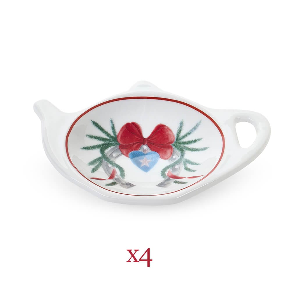Il set da 4 piattini in porcellana Nuvole di Stoffa, della collezione La Giostra di Amelie, è un concentrato di grazia e spirito natalizio. La forma a teiera richiama le atmosfere intime del tè invernale, mentre il decoro centrale – un fiocco rosso, un cuore azzurro con stella e due ferri di cavallo – richiama simboli di fortuna e affetto, arricchiti da rami di abete e un bordo rosso sottile.