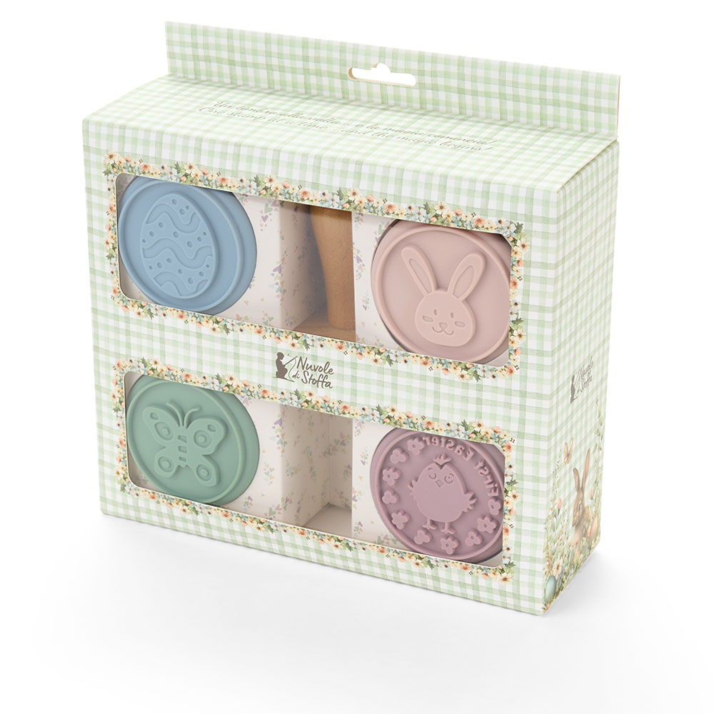 Il set 4 timbri in silicone con manico in legno della collezione PePen Nuvole di Stoffa è pensato per chi ama curare ogni dettaglio delle proprie creazioni dolci. I timbri, realizzati in silicone alimentare morbido e flessibile, presentano delicati motivi pasquali – farfalla, coniglio, uovo e scritta decorativa – che imprimono disegni precisi e armoniosi sull’impasto.