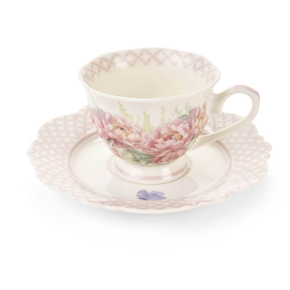 Il set Fiorirà da 6 tazzine con piattino firmato Nuvole di Stoffa è pensato per chi ama curare i dettagli, anche nel gesto più semplice: un espresso dopo pranzo o un caffè con le amiche. Le tazzine (90 ml) hanno una forma elegante e una decorazione raffinata che alterna due fantasie della collezione: peonie rosa cipria con il dolcissimo uccellino, e una variante floreale coordinata, morbida e romantica. I piattini, con bordo ondulato e reticolo rosa, completano la mise en place creando un colpo d’occhio “da boutique”.