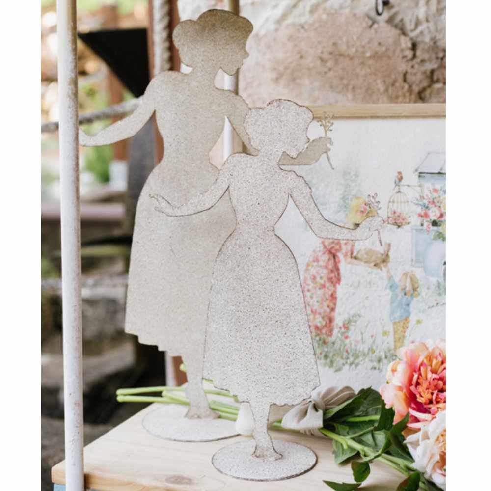 Silhouette decorativa in metallo da appoggio: figura femminile con abito lungo e braccio aperto, che tiene un piccolo fiore. Finitura beige/avorio puntinata con delicata patina anticata, perfetta per uno stile shabby chic elegante e leggero.