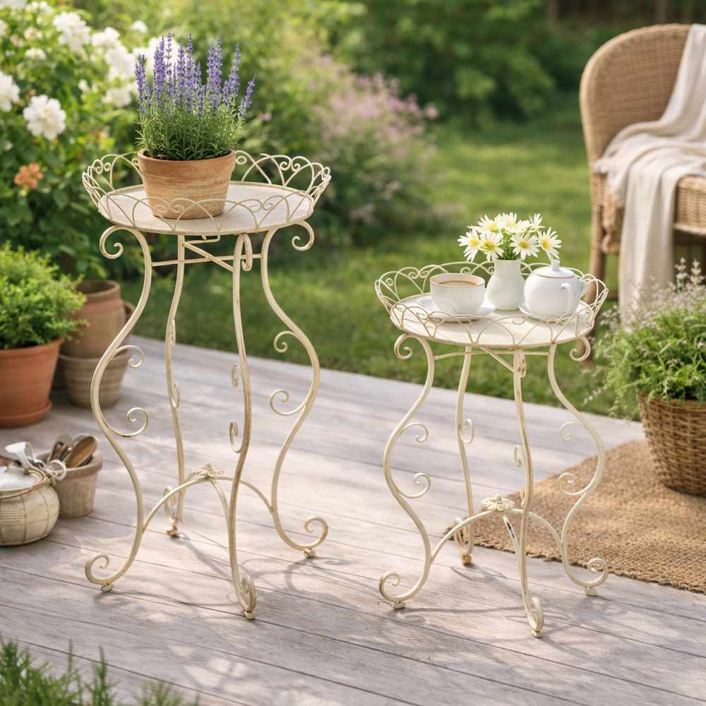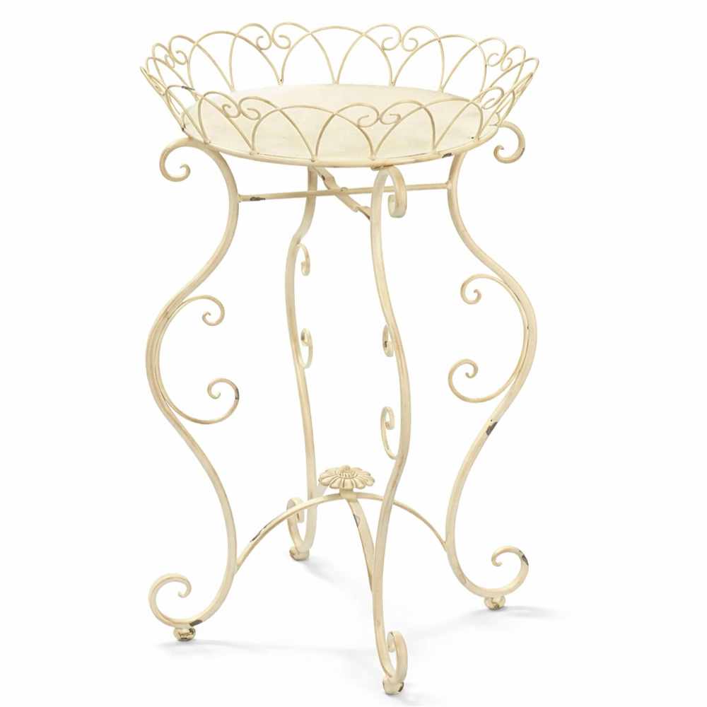 Struttura in metallo avorio con effetto anticato. Piano a vassoio con bordo traforato e riccioli; gambe sinuose con volute e fiore centrale alla base. Perfetto per piante, candele o un set da tè.