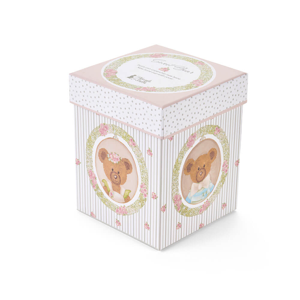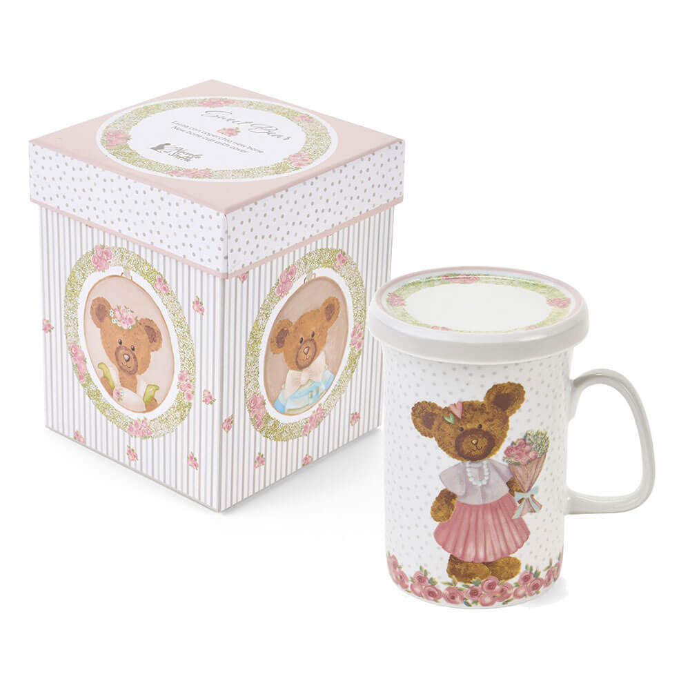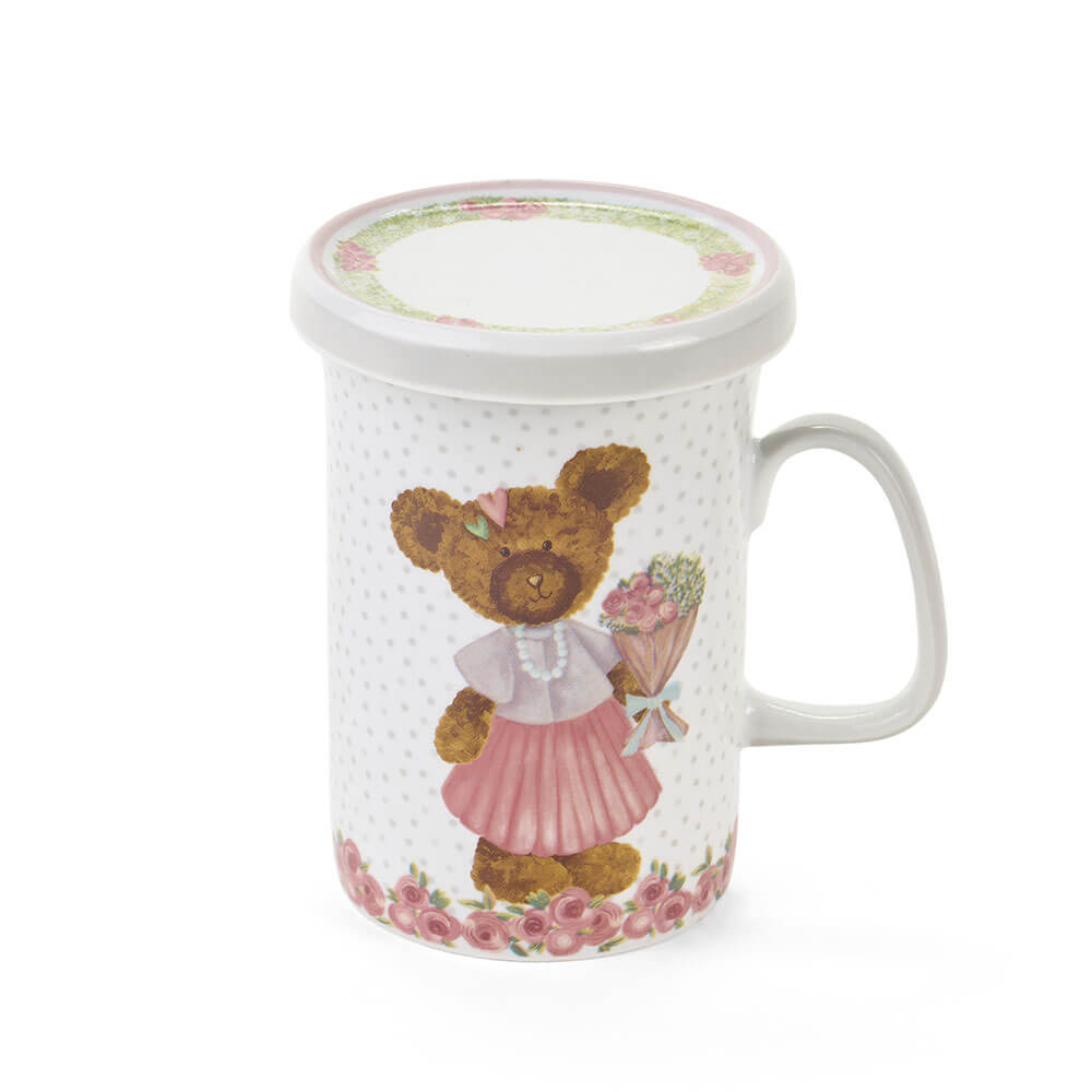 Tazza in porcellana della collezione Sweet Bear con fondo bianco a micro pois e illustrazione romantica dell’orsetta con gonnellina rosa e bouquet, rifinita da una bordura di roselline sul fondo. Il coperchio coordinato (bianco con ghirlanda floreale) aiuta a mantenere la bevanda calda più a lungo; bordo rosa cipria e manico comodo. Completa di scatola regalo abbinata con righe, pois e medaglioni Sweet Bear.