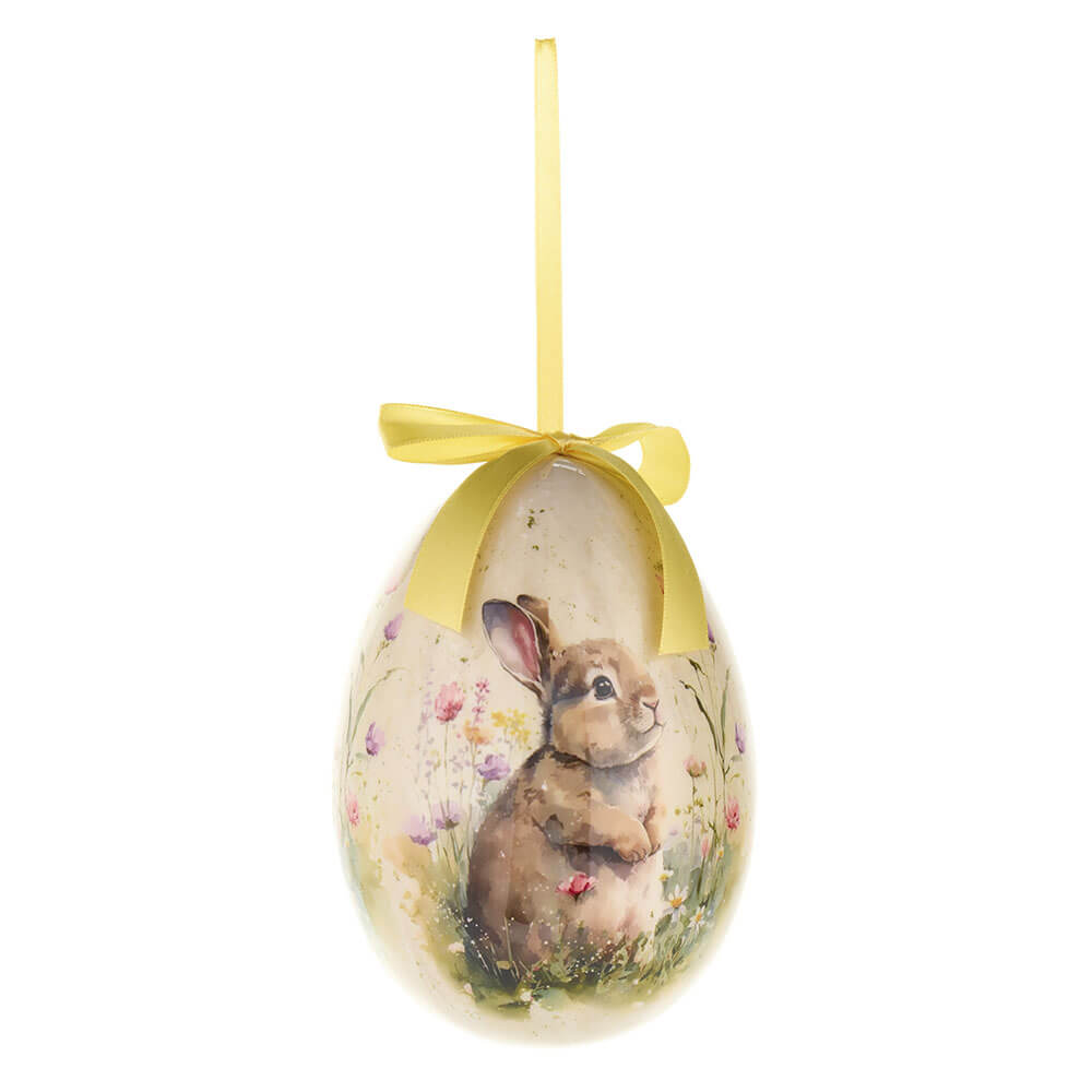 Questo uovo decorativo Nuvole di Stoffa della collezione PePen è realizzato in poliestere con finitura liscia e leggermente opaca. Il colore giallo tenue dona luminosità, mentre la decorazione con coniglietto e fiori, dipinta con effetto acquerello, crea un’atmosfera dolce e primaverile. Il nastro giallo in raso permette di appenderlo a rami decorativi o di usarlo come punto focale in una composizione pasquale. Perfetto per impreziosire la casa con un tocco shabby chic raffinato.
