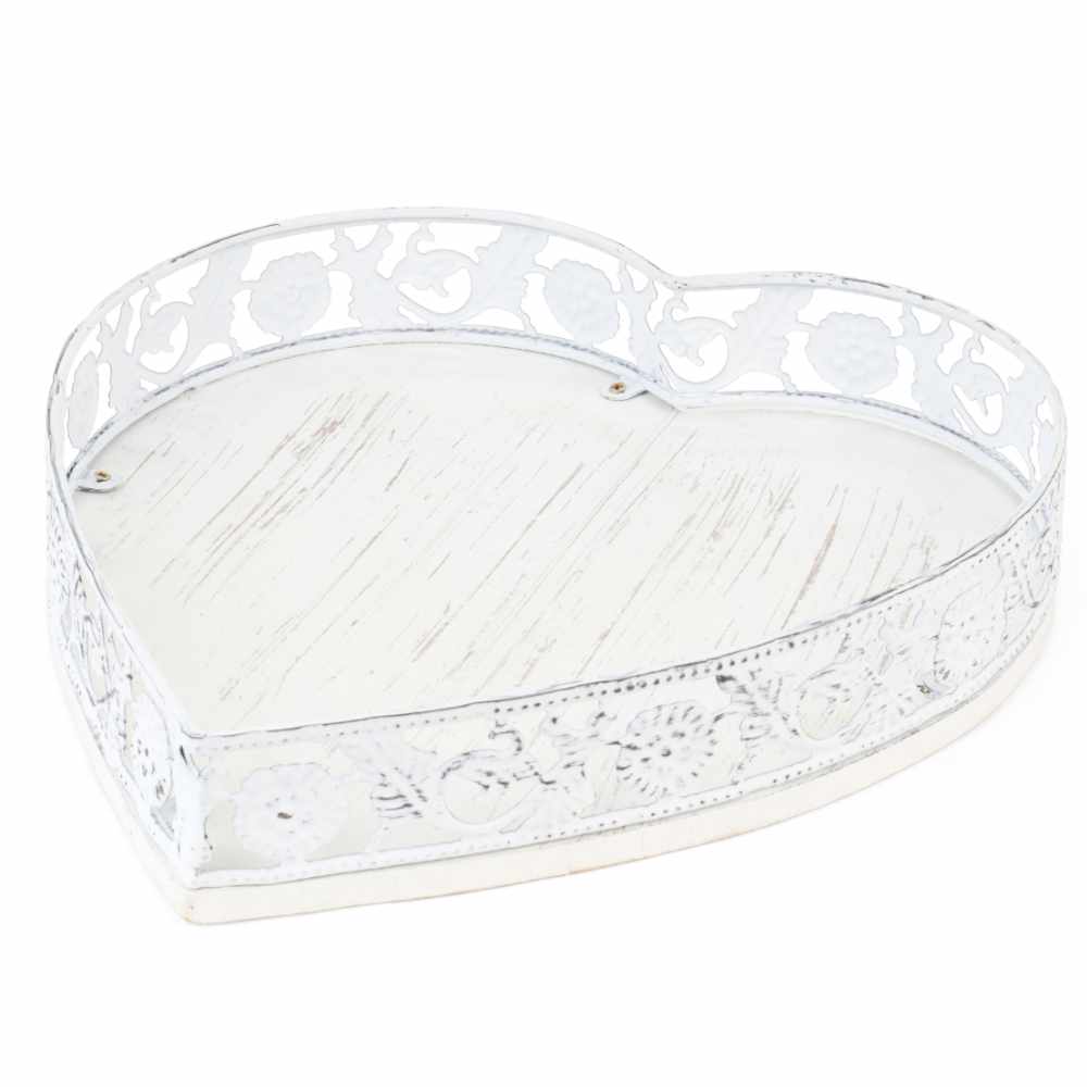 Vassoio grande a forma di cuore in metallo verniciato bianco, con finitura shabby leggermente anticata e top effetto “doghe” segnate da leggere venature. Il bordo rialzato è traforato con motivi floreali e volute, per un elegante effetto pizzo.