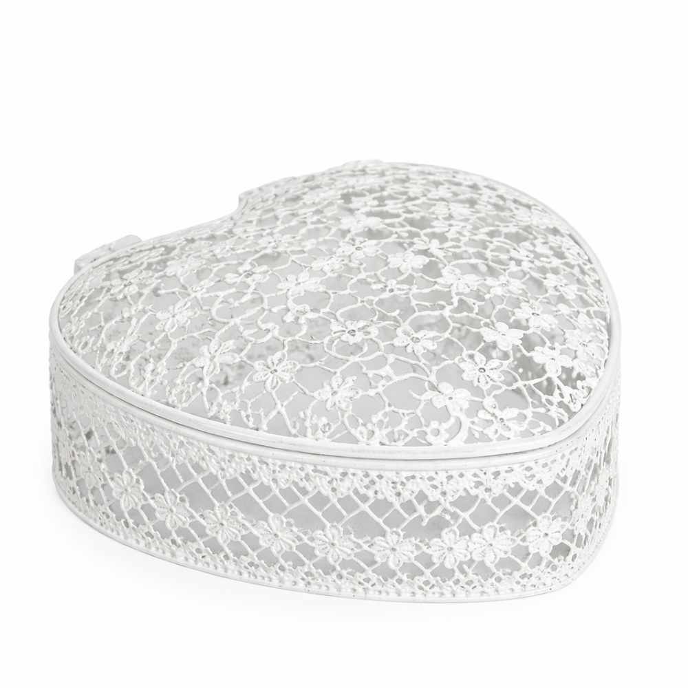 Versione compatta della classica scatola a cuore: portagioie in metallo sbiancato con coperchio traforato a motivo arabescato. Perfetta per anelli, orecchini e piccoli bijoux, bella anche come dettaglio décor su comò o mensola.