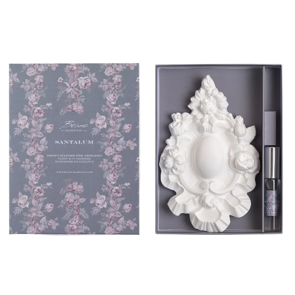 Scatola completa di gesso profumato a forma di medaglione e una ricarica di profumo all’essenza di sandalo da 15 ml. Fa parte della collezione Antichi Profumi di Blanc Mariclo.