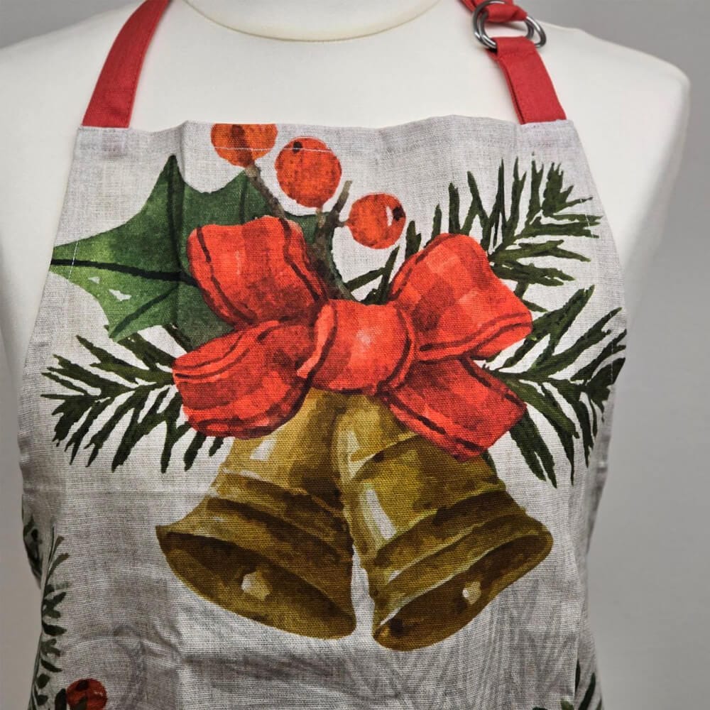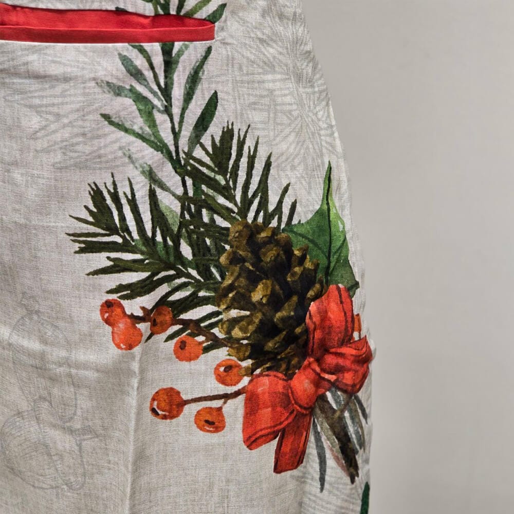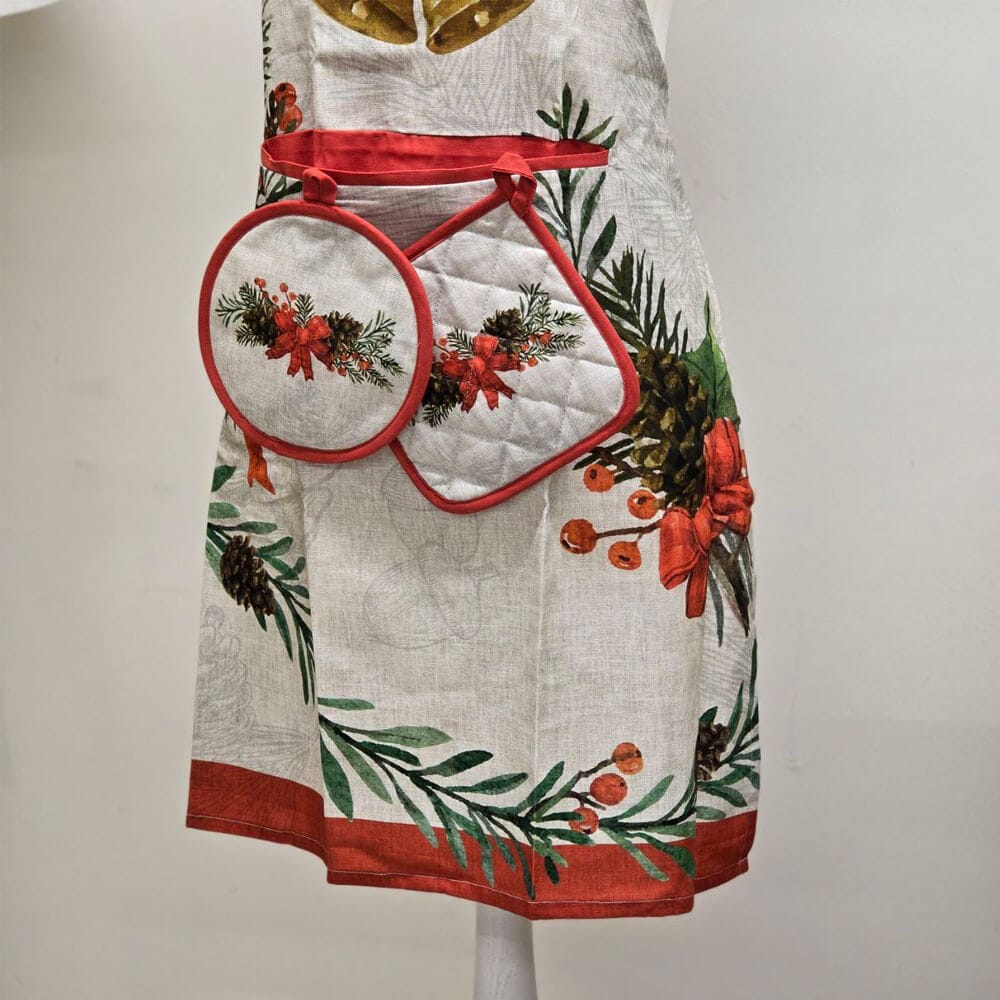 Set cucina composto da un Grembiule e Coppia di presine natalizie della collezione Vischio porta un tocco di eleganza e tradizione alla tua cucina durante le festività.
