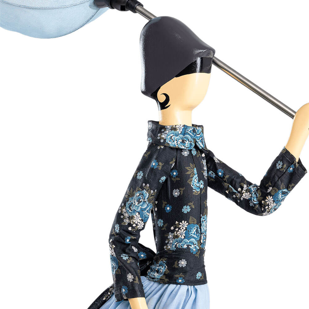 Realizzata a mano in Grecia, rappresenta una giovane donna che cammina controvento, sorreggendo un ombrello che si trasforma in un delicato paralume azzurro.