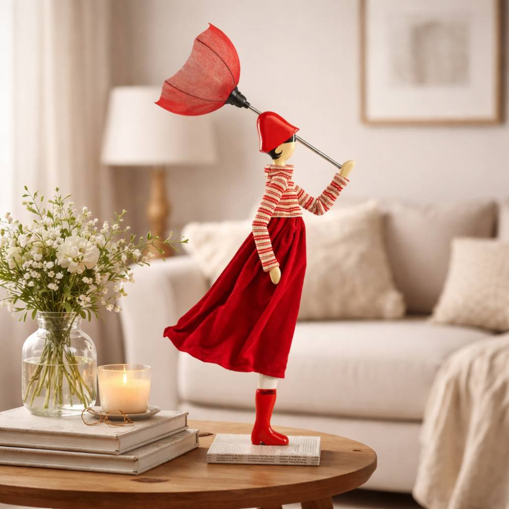 Realizzata a mano in Grecia, questa lampada da tavolo in legno raffigura una figura femminile elegante e sognante, colta dal vento mentre stringe un ombrello che diventa il suo paralume rosso luminoso.