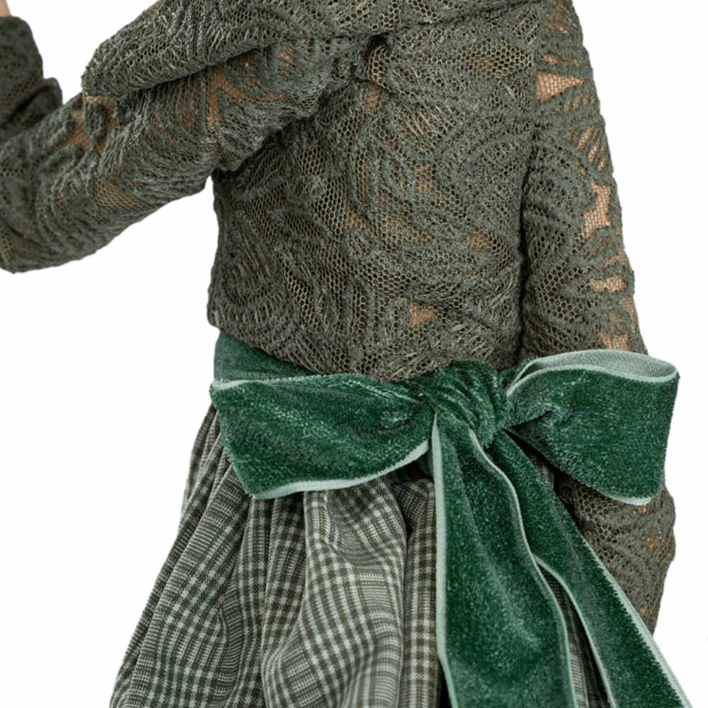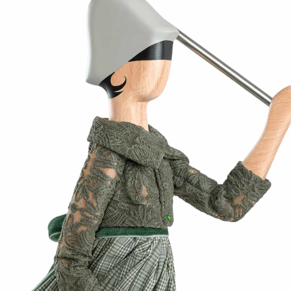 L’abito dai toni verdi, impreziosito da dettagli sartoriali e cintura in velluto, si armonizza con la base in legno di faggio, trasformando questa lampada da tavolo in legno in un complemento d’arredo distintivo. Perfetta per salotti e camere da letto, Marthilia dona carattere, poesia e un raffinato tocco botanico agli spazi.
