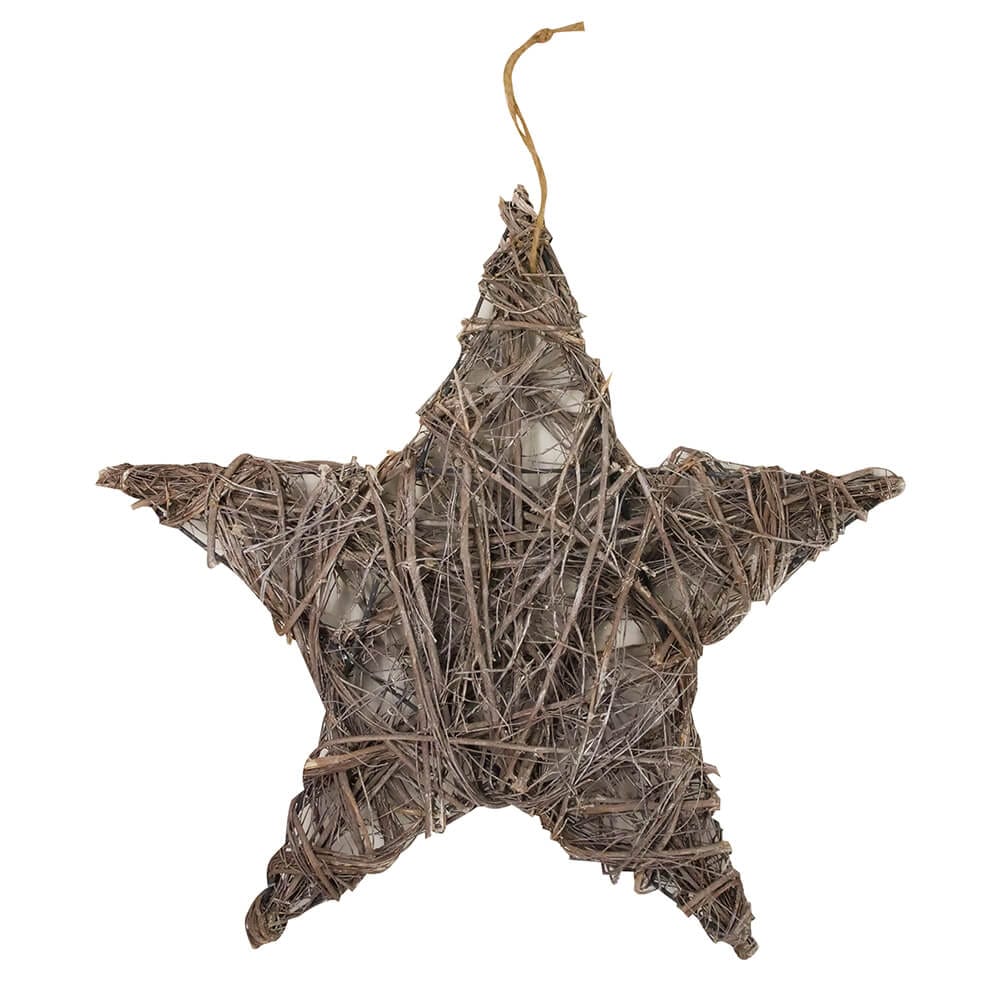 Stella da appendere realizzata con tantissimi rametti intrecciati tra loro. Ideale per un ambiente country.