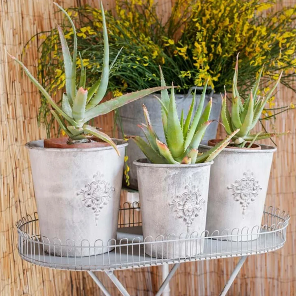 Vaso in metallo arricchito da un fregio in rilievo, utilizzali per esaltare i colori dei tuoi arredi inserendo piante vere o artificiali.