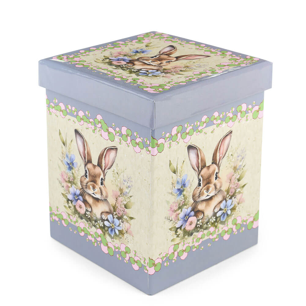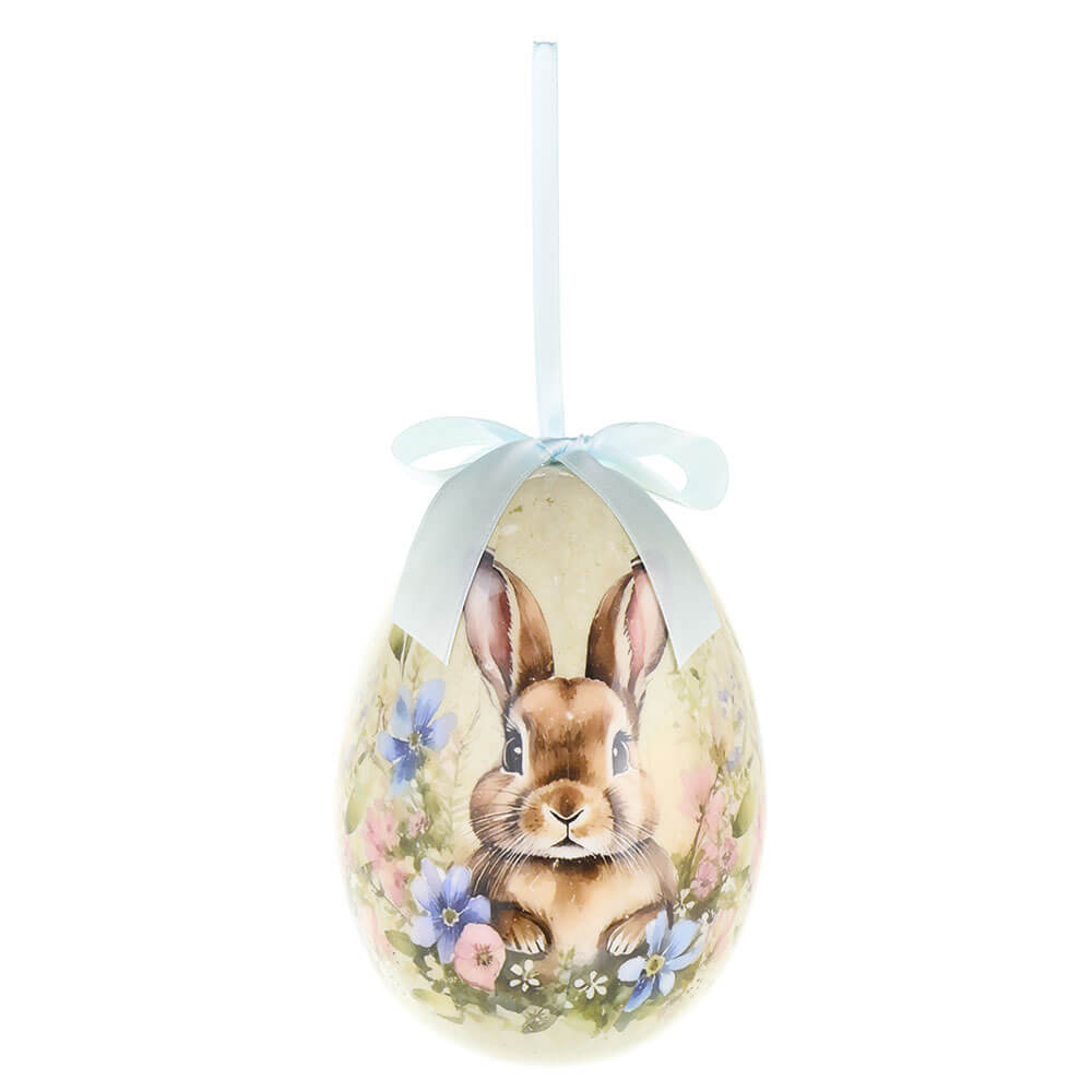 Raffinato uovo pasquale decorativo azzurro della collezione PePen, realizzato in polistirolo e decorato con dolci illustrazioni primaverili. Completo di nastrino coordinato e scatola decorata, è perfetto come elegante decorazione pasquale o come idea regalo.